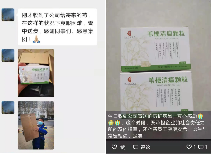 2021年,新冠疫情再度爆發,香港旭日集團及常宏本部心系員工健康,選了經過2020年初抗疫前線應用的有效藥品「葦梗清瘟顆粒」(「備案文號」贛藥制備:Z20200002000)發放給全體員工。1月初,常宏將首批顆粒發放給一線工人,后受疫情影響,在石家莊市快遞恢復的第一時間,14日起陸續將藥品以郵寄的形式發放給全體員工,用于大家預防新冠肺炎,以實際行動關心關愛員工,讓大家安全感滿滿。