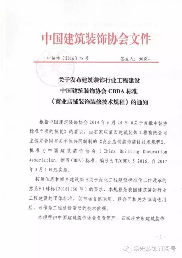 中國建筑裝飾協會11月21日發文稱,根據中國建筑裝飾協會2014年6月24日《關于首批中裝協標準立項的批復》的要求,由石家莊常宏建筑裝飾工程有限公司主編并會同有關單位共同編制的《商業店鋪裝飾裝修技術規程》,批準為中國建筑裝飾協會CBDA標準,編號為T/CBDA-5-2016,自2017年3月1日起實施。