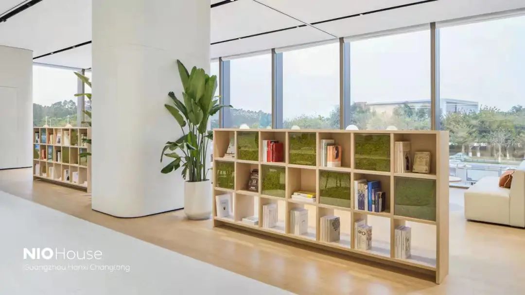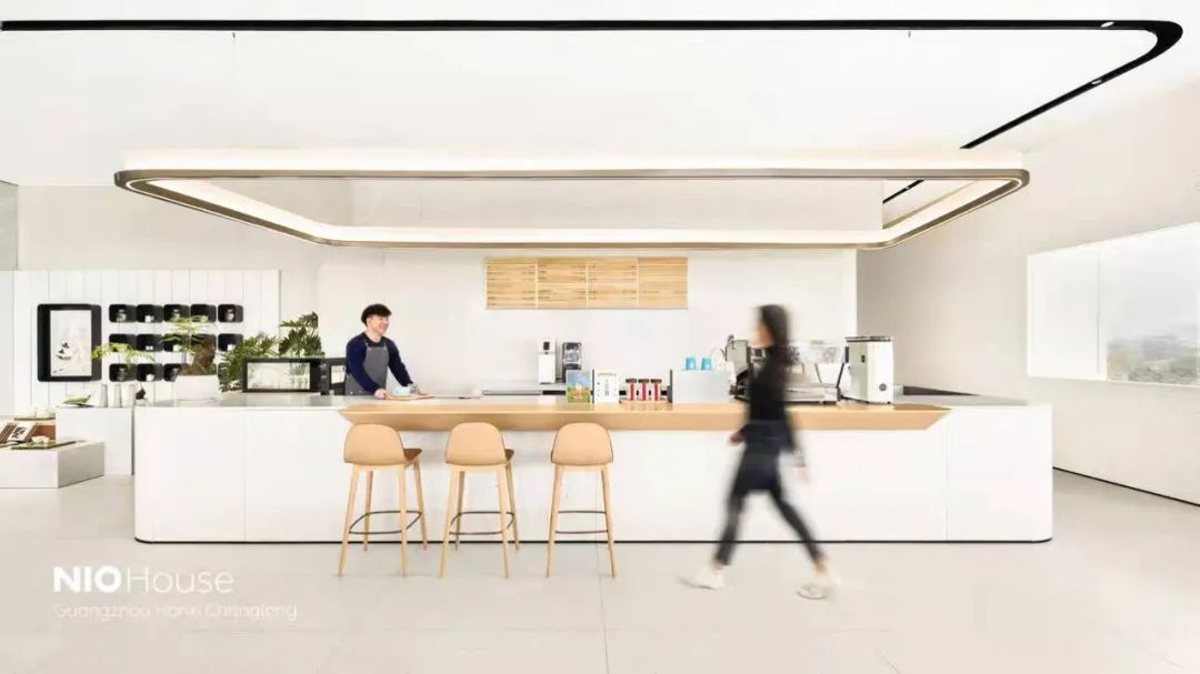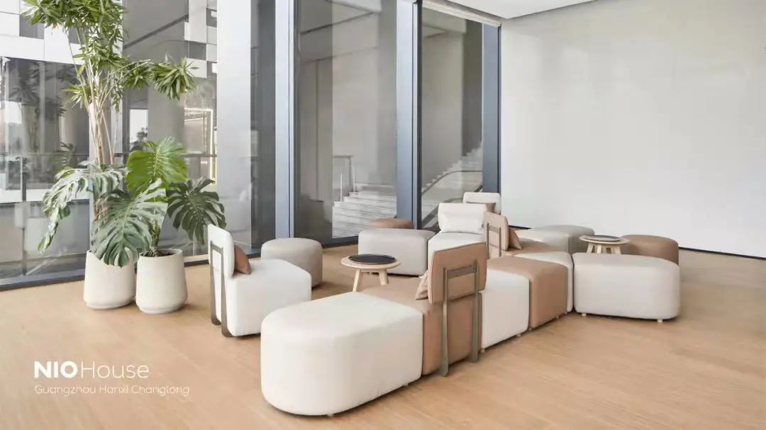 蔚來中心·廣州漢溪長隆牛屋采用2層結構,展廳一如既往地采用蔚來純粹、精致、科技感的風格,整體以米白色為主,不銹鋼鏡面頂面、水磨石墻面,搭配實木飾面設計,空間更加通透,更具未來感。